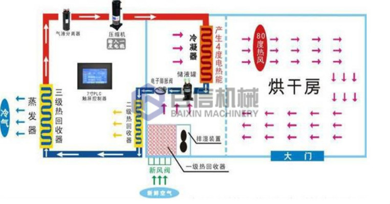 1、主機(jī)(加熱系統(tǒng)):利用輸入很少的電能吸收空氣中的免費熱量,用來烘干物料。